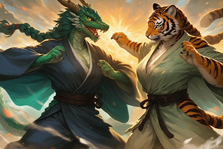 BEAUTIFUL ARTWORK THAT ILLUSTRATES THE ETERNAL SPARRING OF TWO MYTHICAL BEINGS THAT BRING BALANCE TO ETERNITY THROUGH THEIR UNION.